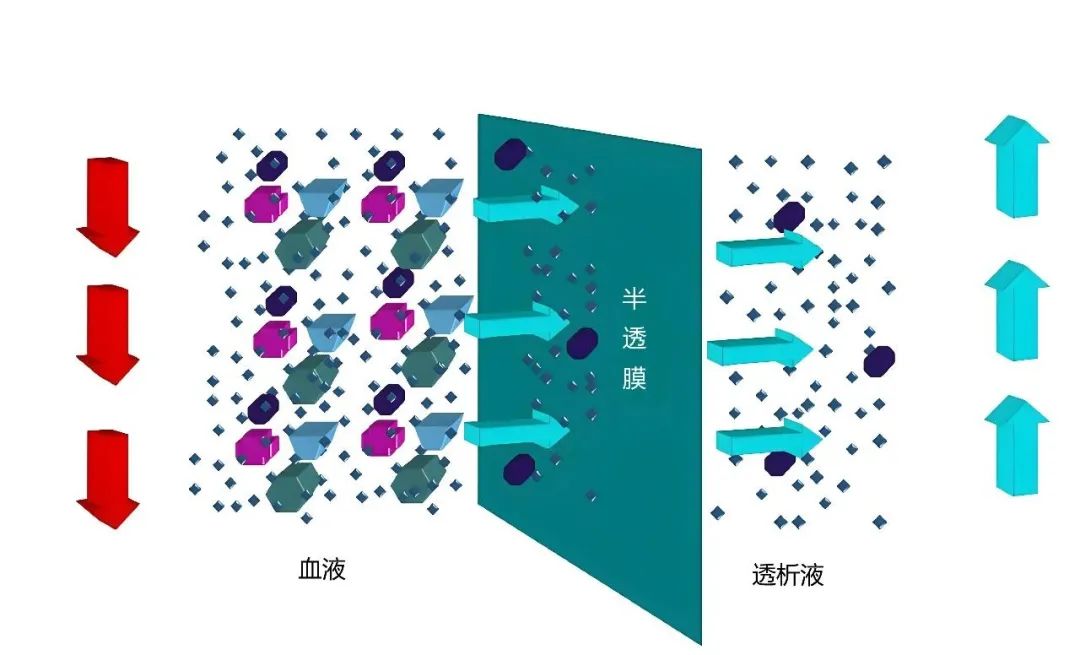 血液透析的主要物理原理為彌散,如墨汁在水中的擴散,依靠著濃度梯度,讓“墨汁分子”慢慢向清水擴散。同樣,由于半透膜的兩側有濃度差,能讓濃度高一側(血液)中的物質往濃度低(透析液)的那一側流動。