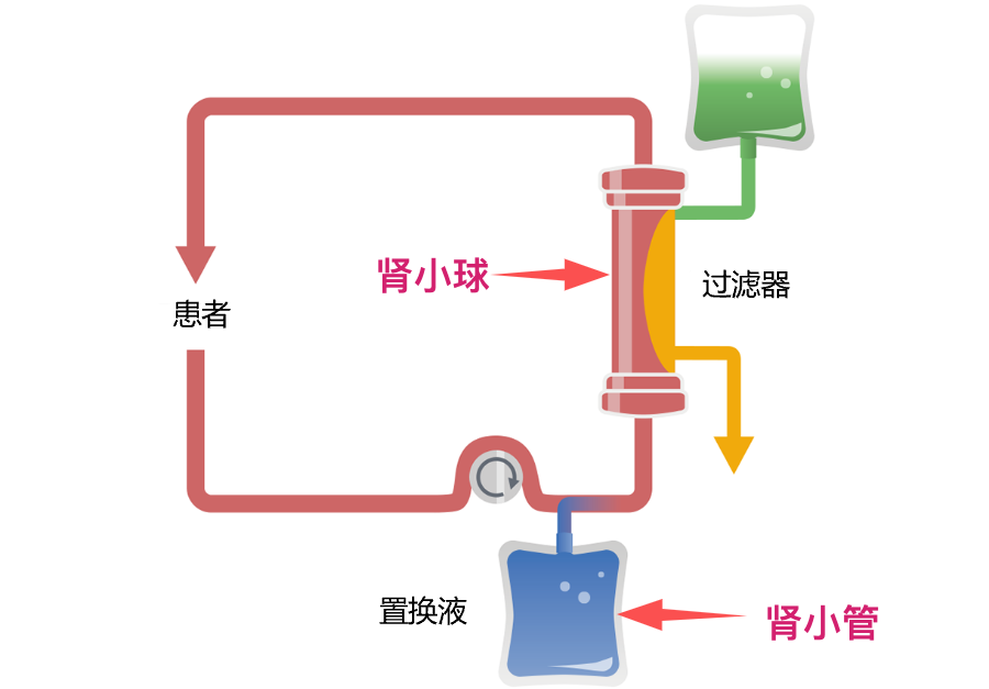 同時,血液濾過時還會不斷補充與人體內環境成分相似的置換液,這就類似腎小管的作用,重吸收原尿(及分泌一些物質)最終回輸血液。
