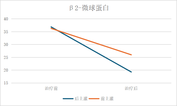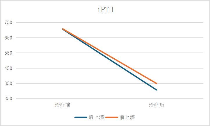 由于后上灌先進行2個小時的透析治療,血液經過超濾,處于相對濃縮的狀態,此時血液內中大分子毒素濃度相對較高。此時再行灌流治療,尿毒癥毒素會被灌流器的吸附顆粒大量吸附,從而提高灌流治療效果。如圖1和圖2,相對于前上灌,后上灌對中大分子毒素iPTH和β2-微球蛋白的清除效果更好。因此,后上灌更有利于清除中大分子毒素。