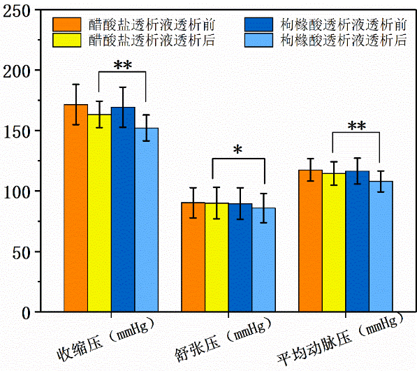 在血液透析過程中離子鈣水平是心血管反應的重要決定因素。伴隨血清離子鈣水平的下降,透析患者的心肌收縮力及外周血管阻力降低從而導致血壓下降。徐斌等采用交叉實驗設計證明使用枸櫞酸碳酸氫鹽透析液治療的透析患者心血管系統穩定性明顯優于普通碳酸氫鹽透析液患者,其血壓控制佳(圖3)、高血壓發生率更低(3.3% vs 20%, P < 0.01)。[5]