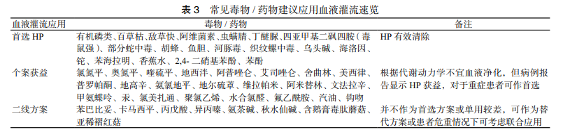 研究顯示,在臨床實踐中,多數毒物/藥物并不全部滿足上述特征,但仍以血液灌流作為首選血液凈化方式。常見毒物/藥物建議應用血液灌流速覽見表3。