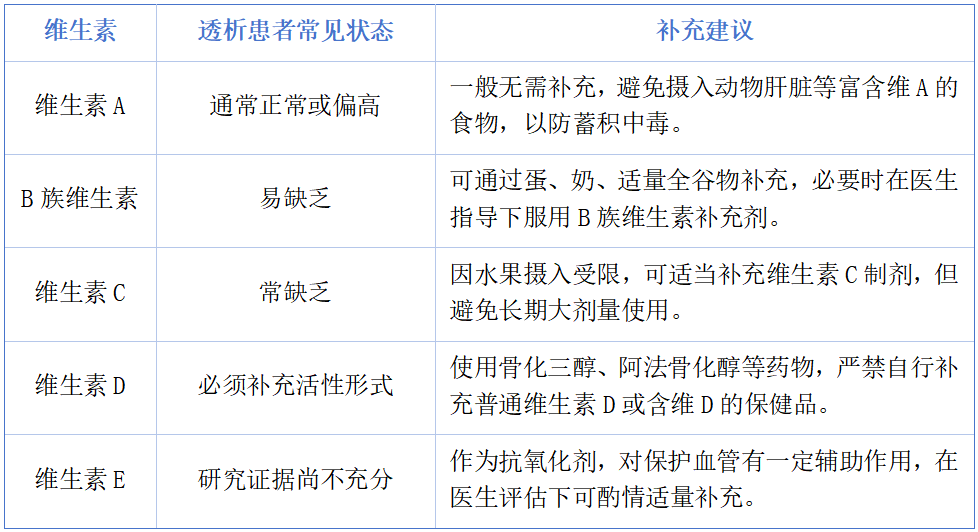 鈣:常需通過鈣片補充,但需監測血鈣,避免與高磷共同導致異位鈣化。